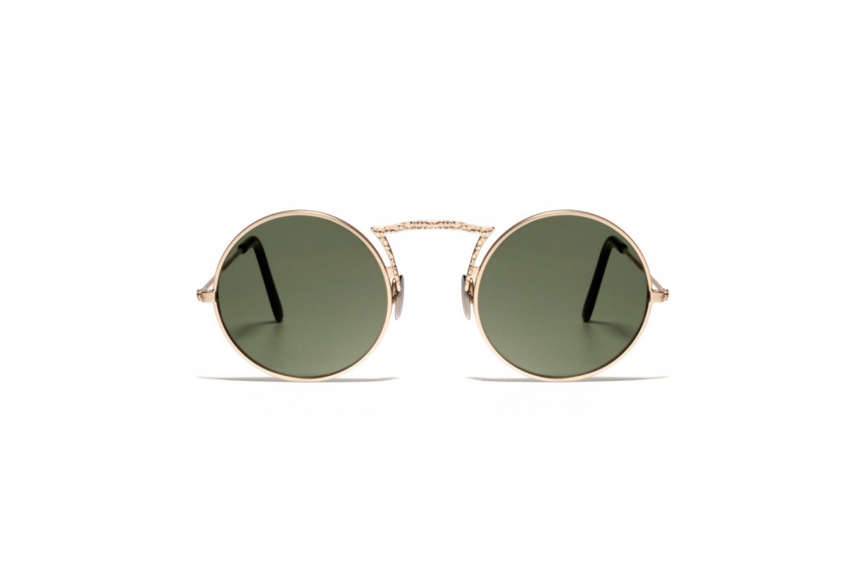 In perfect harmony, the hand-battered metal bridge finds its ideal counterpart in the iconic round frame, meticulously handcrafted in Italy from a durable metal alloy and adorned with tempered mineral glass lenses. This exquisite combination showcases the epitome of artistry and craftsmanship.